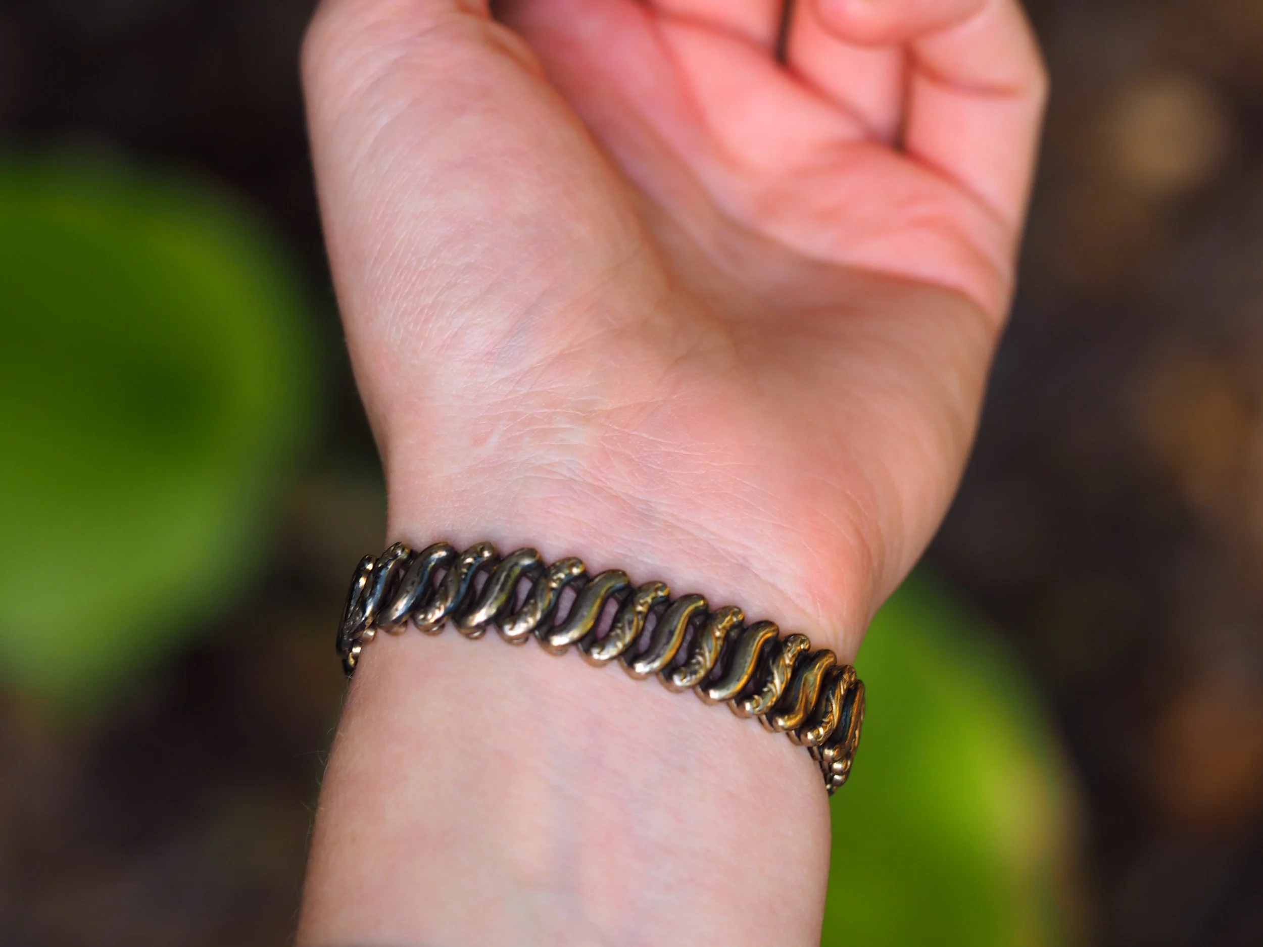 Vintage gold filled expansion bracelet centering an etched heart plaque with "S" shaped links featuring an alternating engraved pattern giving this 1940s bracelet a Victorian look.