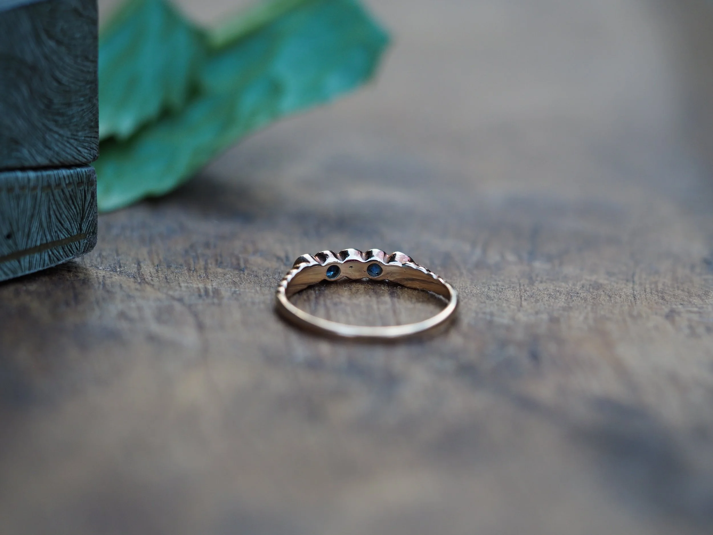 Antique 10k rose gold Edwardian era band style ring with an alternating pattern made up of bezel set seed pearls and synthetic sapphires. The shoulders of the band feature delicate scrollwork carved in high relief.