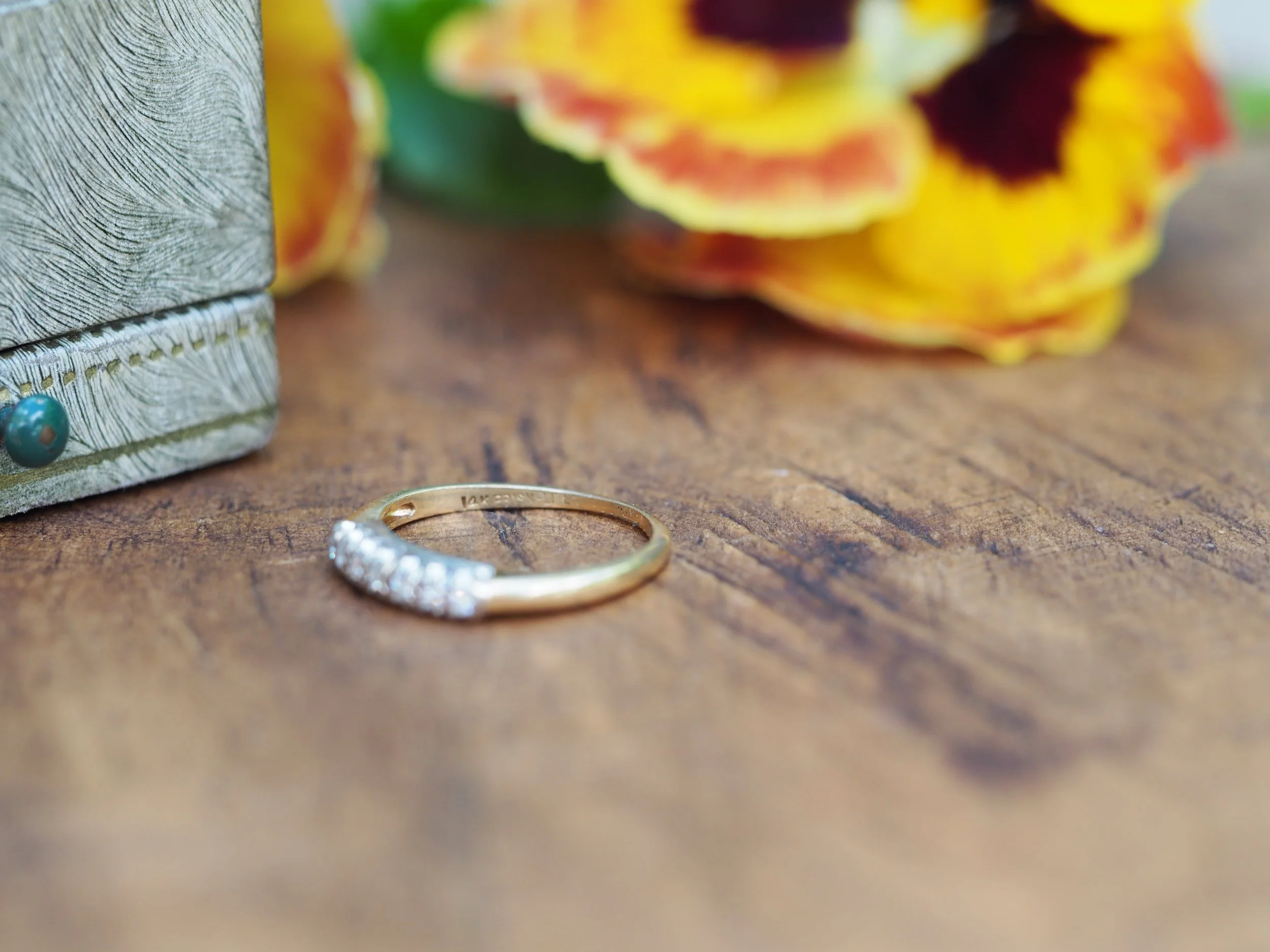 Vintage solid 14k gold wedding band featuring seven single cut diamonds in white gold prong settings with a delicately scalloped undergallery. The diamonds rest atop a yellow gold shank with a gradual taper towards the base of the finger. The diamonds have an approximate combined weight of 0.10 ct.
